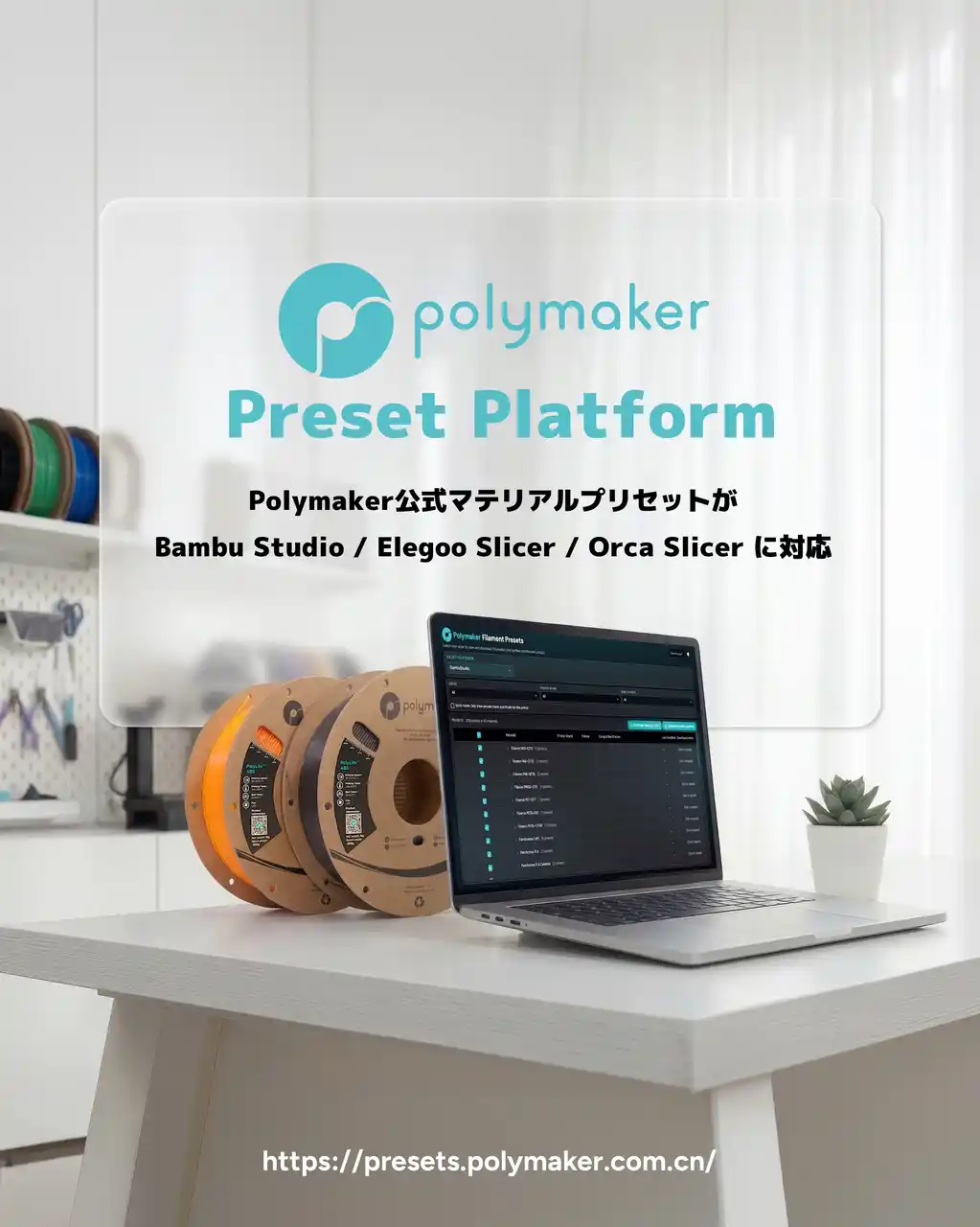 | 「Polymaker Preset Platform」は、対応する3Dプリンターごとに最適化されたマテリアルプロファイル(造形設定)をダウンロードできるオンラインプラットフォームです。 | |||