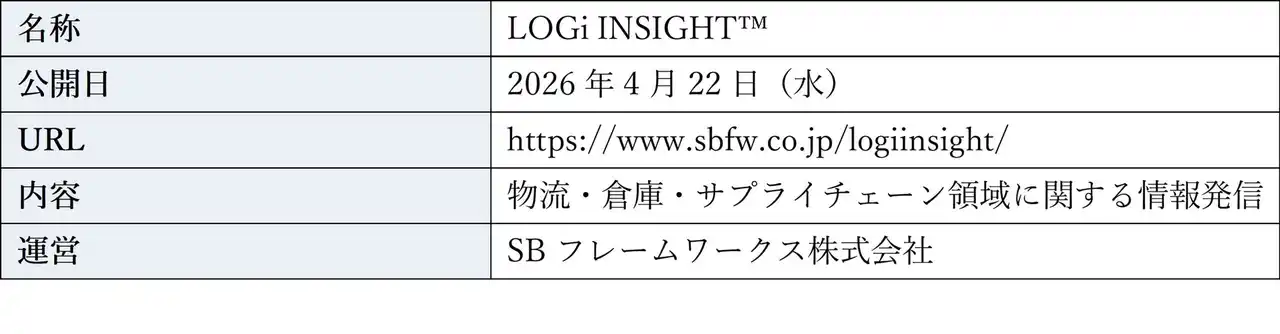 SBフレームワークス株式会社(本社:東京都中央区、代表取締役 社長執行役員:菅野 信義、以下「当社」)は、物流・倉庫・サプライチェーン領域に関わるビジネスパーソン向け専門メディア「LOGi INSIGHT(TM)」を、2026年4月22日(水)に公開します。