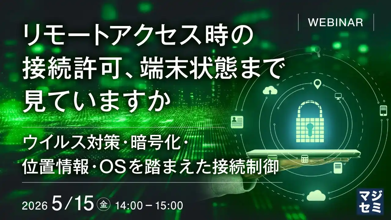 | マジセミ株式会社は「リモートアクセス時の接続許可、端末状態まで見ていますか」というテーマのウェビナーを開催します。 |