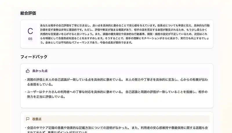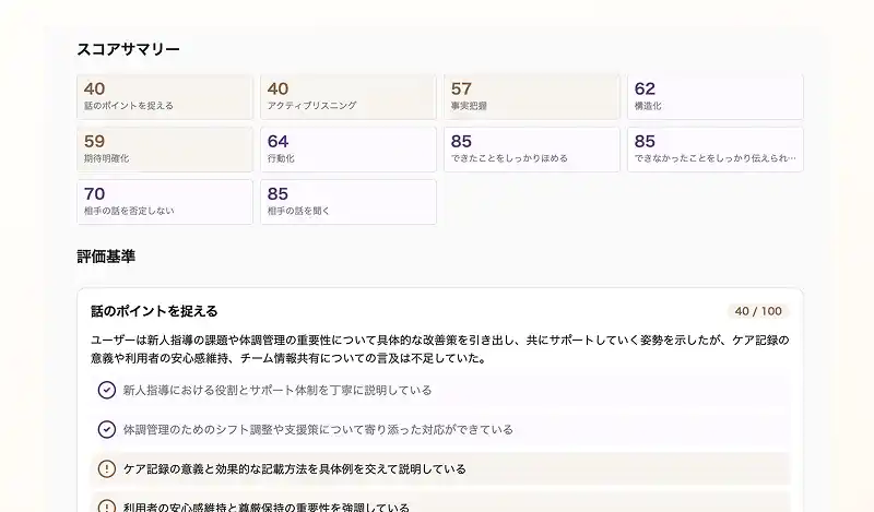 ロープレ実施後にAIが自動で生成する評価レポートでは、設定されたすべての評価基準に基づく総合点・総評と、評価基準ごとの評点・コメントが表示されます。 |