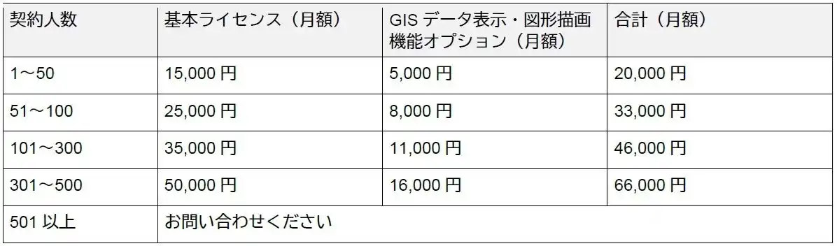 本機能は、「MAPPLE地図プラグイン for kintone」の基本ライセンスに加えて、「GISデータ表示・図形描画オプション」をご契約いただくことで、両機能(機能1:GISデータ表示、機能2:図形描画)を合わせてご利用いただけます。 「GISデータ表示・図形描画機能」オプション料金(税抜) |