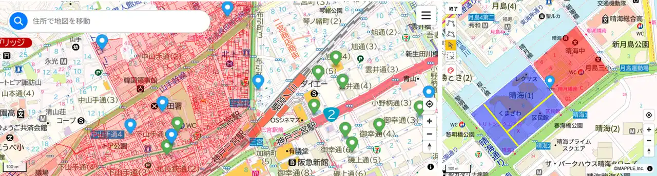 | 「MAPPLE地図プラグイン for kintone」は、サイボウズ株式会社が提供する「kintone」上で、マップルが持つ高精度な地図データを活用し、顧客管理や物件管理、現場管理などの業務を視覚化するサービスです。 | ||||||||