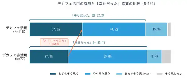 特筆すべきは幸福感の質の差です。デカフェ活用者は「とてもそう思う」が37.3%と非活用者(27.3%)を約10ポイント上回っており、デカフェが単なる代替品にとどまらず、妊娠・授乳期の充実感を支える存在となっていることが浮き彫りになりました。