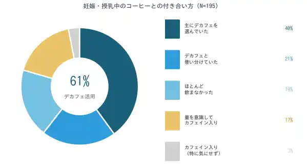 妊娠・授乳中のコーヒーとの付き合い方は、「主にデカフェを選んでいた」(40%)と「デカフェと使い分けていた」(21%)を合わせ、約6割(61%)がデカフェを活用。デカフェを選んだ理由の最多は「赤ちゃんへの影響を考えて」(92%)で、「安心して飲みたかった」(58%)、「罪悪感なく楽しみたかった」(47%)が続きます。