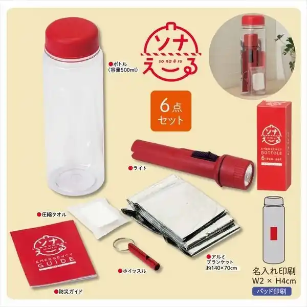 デスクの引き出しやバッグに収まる500mlのコンパクトなボトルに、必要な防災アイテムを集約! ライト・アルミブランケットなど災害時の便利アイテム6点入りです。配布時に「日常の安心」をセットで届けられます。 |