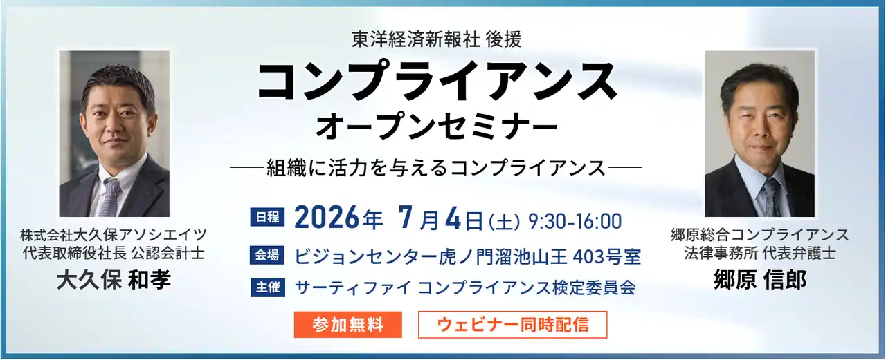 株式会社サーティファイ(本社:東京都中央区、代表取締役:瀧澤茂)コンプライアンス検定委員会は、郷原総合コンプライアンス法律事務所 代表弁護士 郷原信郎氏と、株式会社大久保アソシエイツ 代表取締役社長 大久保和孝氏を講師に招き、「2026年度夏期コンプライアンスオープンセミナー -組織に活力を与えるコンプライアンス-」を2026年7月4日(土)にビジョンセンター虎ノ門 溜池山王とオンライン配信のハイブリッドで開催します。 |