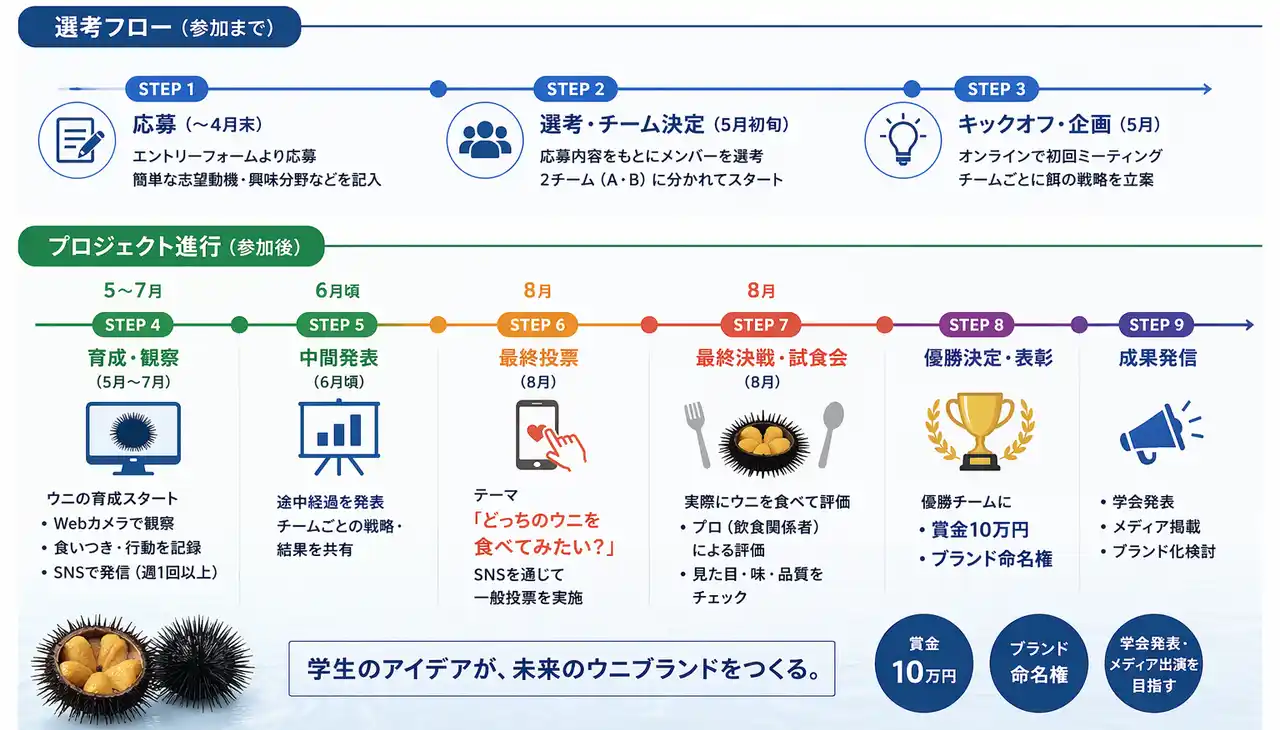 | また、本企画を通じて商品化につながった場合には、学生がそのブランド名を決定することができます。自分たちが考えたウニが実際に評価され、商品になる可能性がある実践的なプロジェクトです。 | |||||||||||||||||||