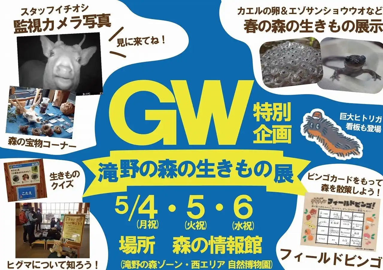 | 連休期間中の滝野公園では、自然を満喫できる生きもの探しや生きもの展、様々な制作を楽しめるラフトなど、お子様はもちろん大人の方も楽しめるイベントを実施します。 | |||||||||||||||