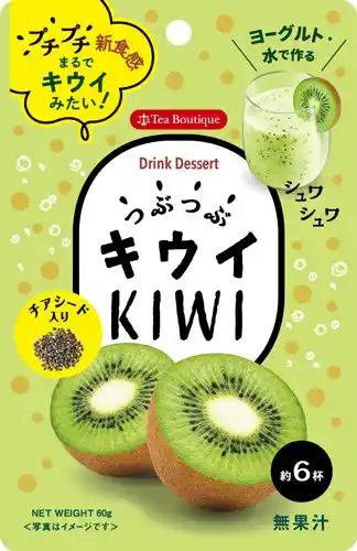 今回発売する「インスタント つぶつぶキウイ」は、チアシードを使うことでキウイのプチプチ感を再現。また、重曹を入れることでシュワシュワ感を加え、楽しい食感のドリンクデザートに仕上げました。粉末なので水に溶かしていただくのはもちろん、かけたり混ぜたりさまざまなアレンジをお楽しみいただけます。 |