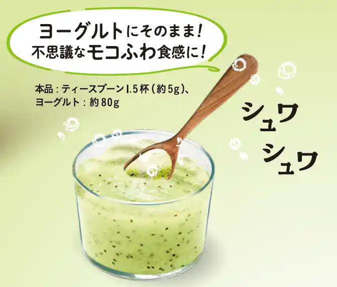 ヨーグルトにそのまま入れるとシュワシュワ泡立ち、不思議なモコふわ食感に!