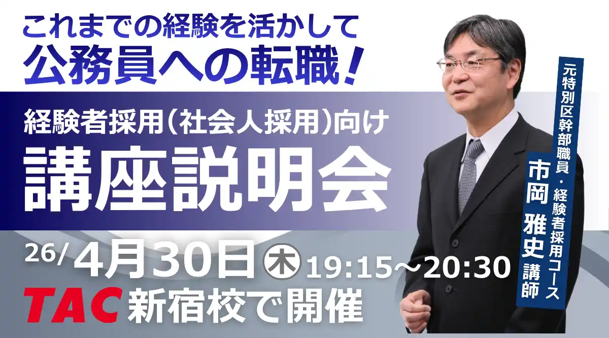 ■対象 概ね20代後半以降の、民間企業等で一定年数の職務経験をお持ちの方 ■内容 まず知っておきたい『社会人が受験できる公務員試験』を皮切りに、『公務員の試験制度の違い』『主な社会人枠試験』へと説明は続きます。最近の公務員試験の傾向を交えながら、ゼロからでもわかるようにご案内していきます。一次試験の基礎学力を測る教養択一試験の出題科目や、経験者区分のキーとなる職務経験論文や職務経験面接といった経験者区分特有の対策についての説明もいたします。 ■講師 市岡 雅史 講師 ■日時/場所 4月30日(木)19:15~20:30 ※TAC新宿校で開催します【※定員30名】 |