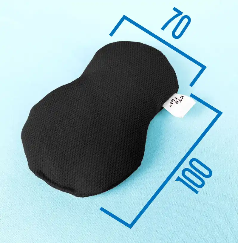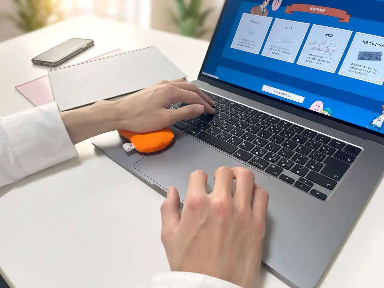 パソコン作業時にはリストレストのように手首を支える使い方もでき、タグ部分にカラビナやボールチェーンを付ければ、外出時にも手軽に持ち運べます。 |