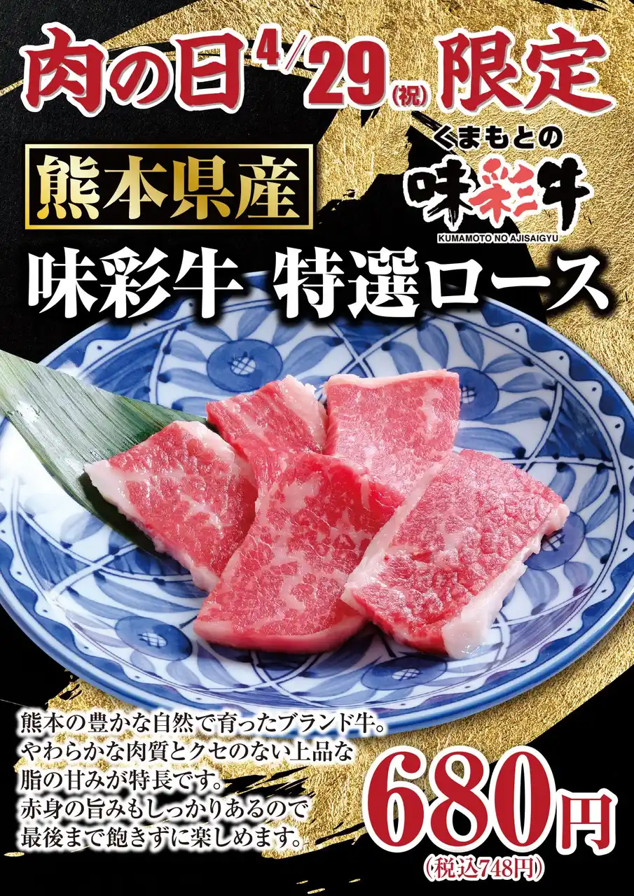 | 株式会社あみやき亭(本社:愛知県春日井市)は、2026年4月29日(祝)の“肉の日”限定で、熊本県産ブランド牛「味彩牛(あじさいぎゅう)」を使用した**「特選ロース」**を特別価格にて販売いたします。 |