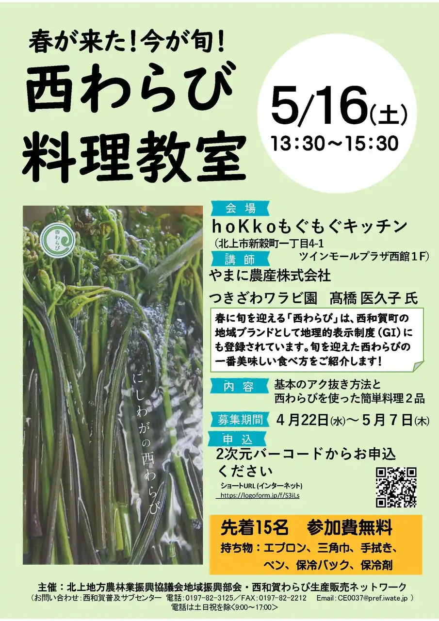 北上地方農林業振興協議会地域振興部会は、2026年5月16日(土)、北上市保健・子育て支援複合施設hoKko もぐもぐキッチンにて、「西わらび料理教室」を開催します。 |