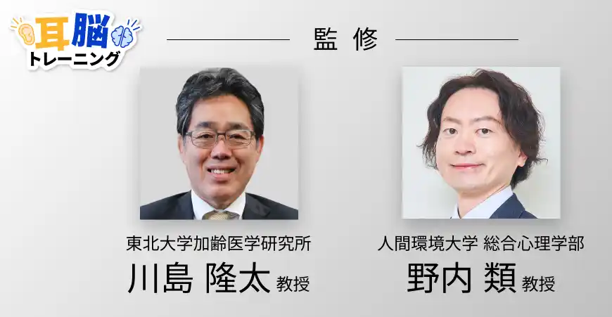 音を認識するには、耳だけでなく「脳」の働きが不可欠です。Olive Airに搭載された『耳脳トレーニング』は、東北大学 加齢医学研究所・川島隆太教授、人間環境大学 総合心理学部・野内類教授の特許技術(特許第7584788号)と、その研究成果である論文(※1)を基に共同開発されました。 |