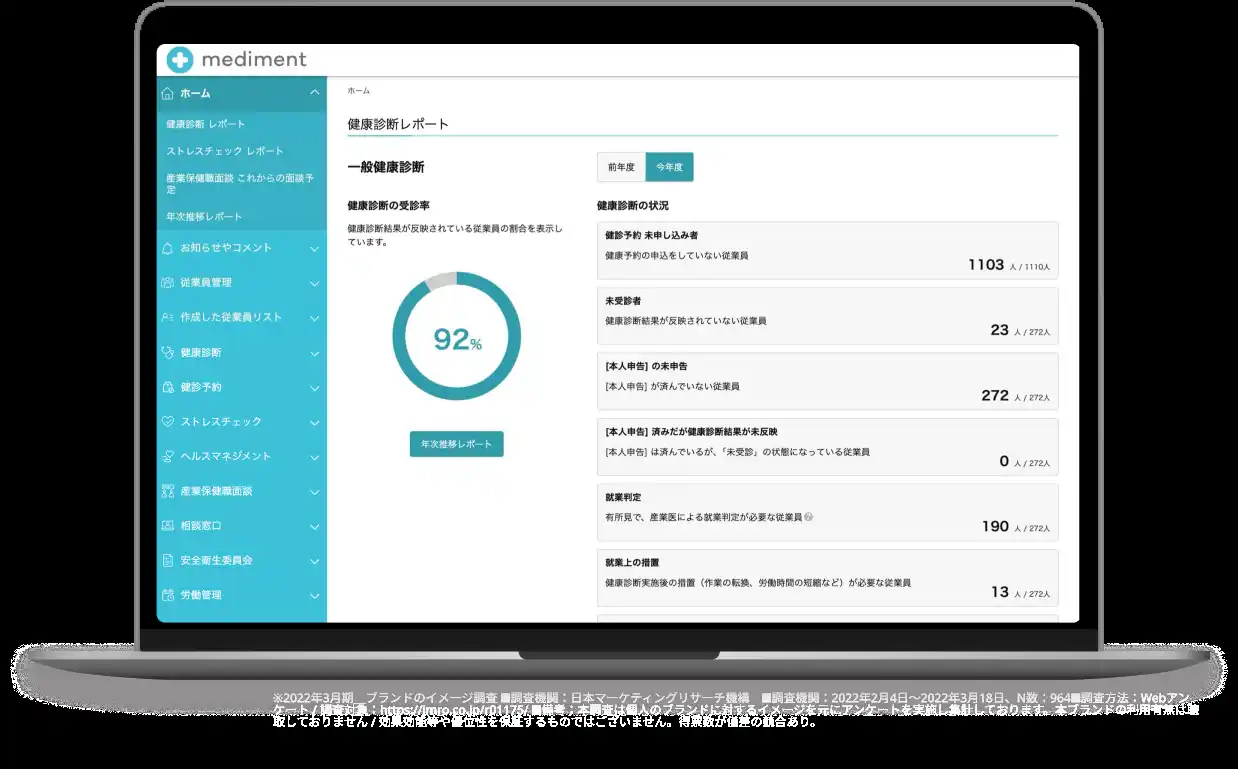 「mediment」は、企業の健康経営を一気通貫で支援するクラウド型健康管理システムです。 |