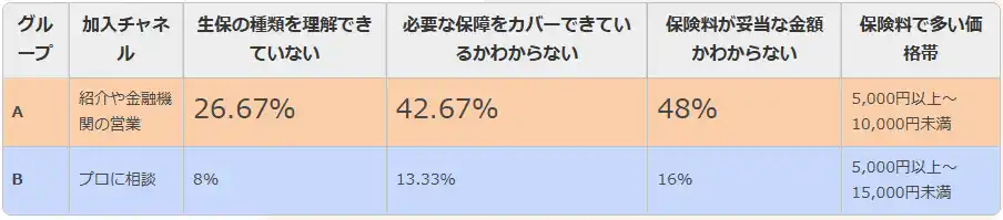 その結果、グループA(紹介や金融機関の営業/生保知識が不足)は、グループB(プロに相談/生保知識が高い)と比較して、自分の保険に対する理解度が低いことがわかりました。 |