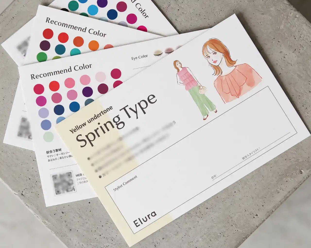 似合う色の一覧・似合うアイテムや素材に加え、おすすめのヘアメイクのカラーなども細かく記載されています。また、スタイリストからのコメントも記載しお渡しいたします。 |