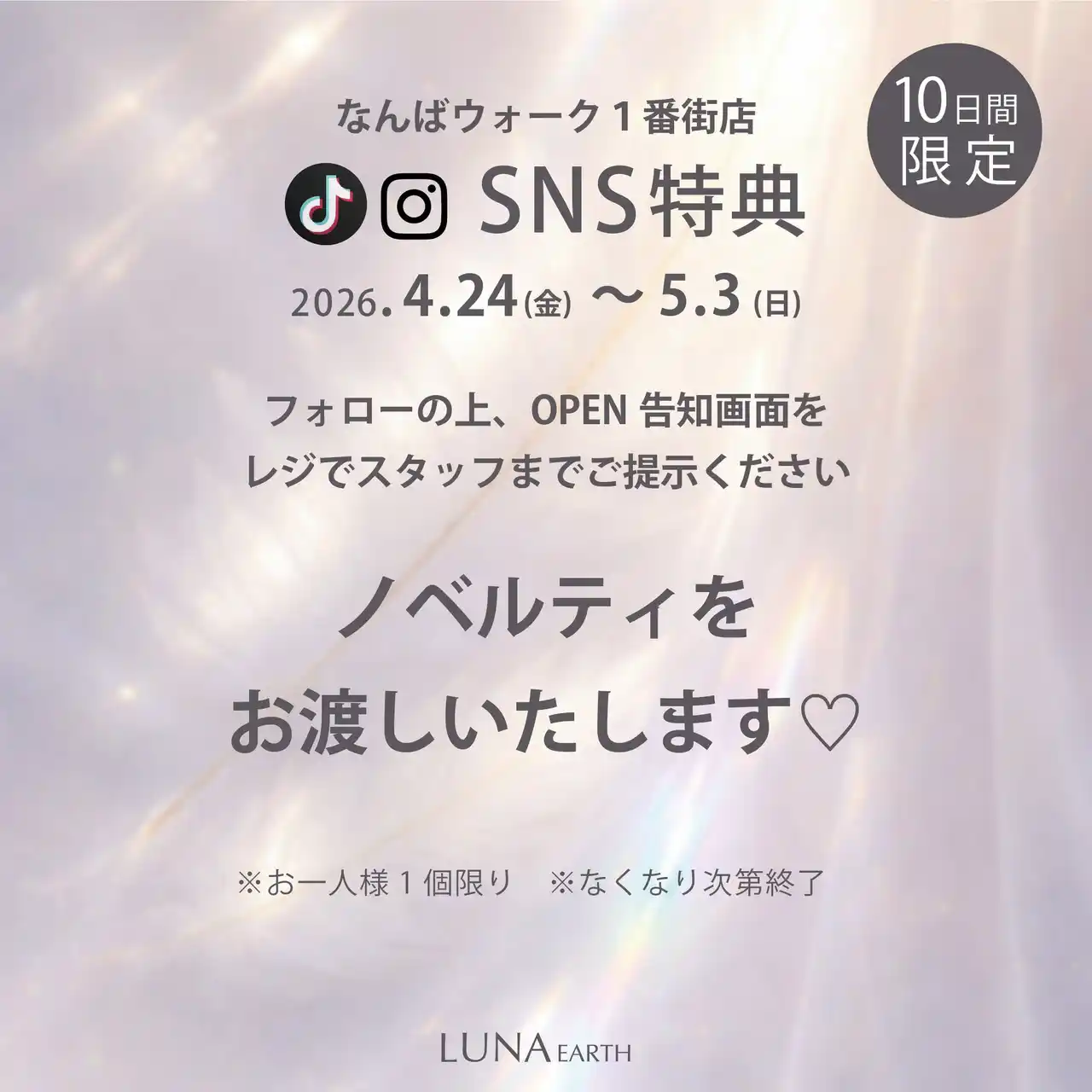 | LUNA EARTHの公式TikTokまたはInstagramアカウントをフォローいただいたお客様を対象に、 | |||