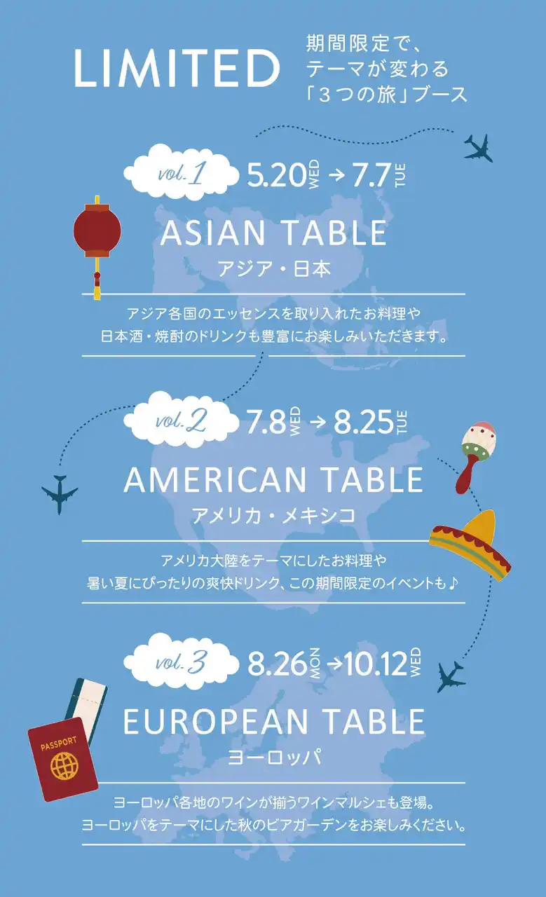 2026年のうめだ阪急ビアガーデンは、 味覚で巡る「旅する屋上ビアガーデン」をテーマに 、アジア、アメリカ、ヨーロッパへと、 期間限定でテーマが変わる“3つの旅”。 香り、スパイス、陽気な音楽。 |
