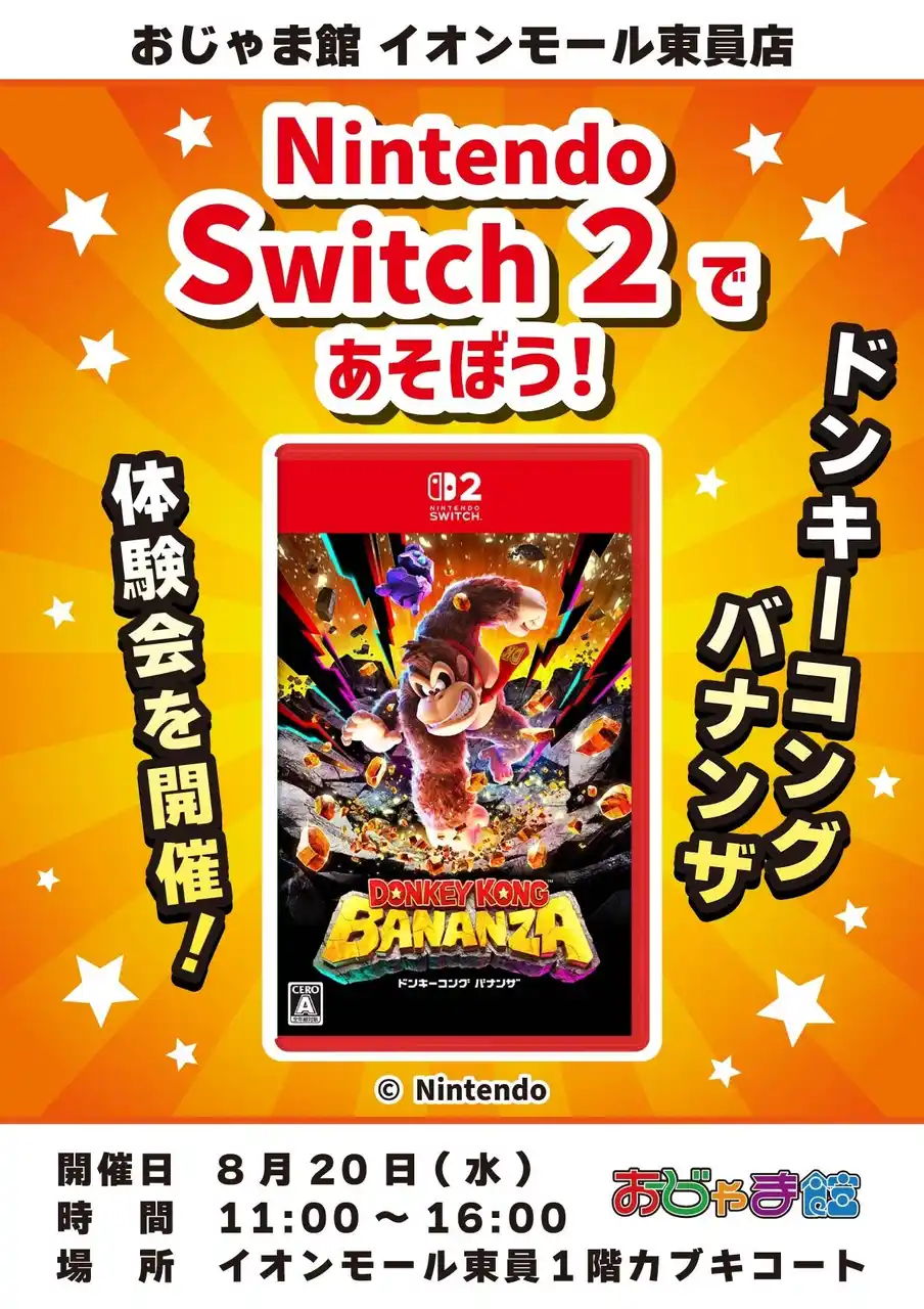 「人生をおもしろくする宝物をとどける。」をグループミッションとして、リユース専門店「お宝創庫」「おじゃま館」「プレイズ」「エコツール」「メディオ!」を運営する株式会社カジ・コーポレーション(エンターテイメント営業本部:愛知県半田市、代表取締役社長:前川 智範、以下、カジ・コーポレーション)は、2025年7月19日・8月9日・8月20日に、「おじゃま館 三宮店」「おじゃま館 イオンモール東員店」にて、任天堂株式会社のNintendo Switch(TM) 2用ソフト「ドンキーコング バナンザ」の体験会イベントを開催いたします。