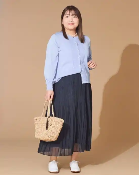 フロントの透かし編みとメタル釦がポイントのカーディガンは、1枚でプルオーバー風に着こなして。 エアリーなシフォン素材のプリーツスカートを合わせ、きちんと見せつつ軽やかに仕上げました。お出かけにはもちろん、小物を変えればオフィスにもマッチするきれいめカジュアルスタイルです。 |