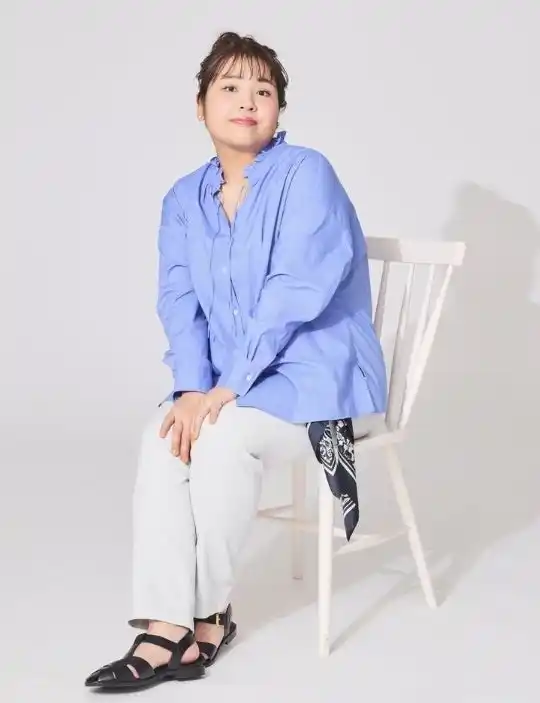 デコルテをきれいに見せるフリルカラーと、鮮やかなブルーが目を惹く着映えブラウス。すっきりとしたシルエットのテーパードパンツを合わせ、シャープにまとめました。ウエストに添えたプリントスカーフもさりげないアクセントに。 |