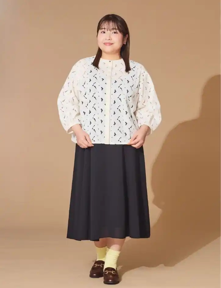 レースの透け感が着こなしに奥行きを与えてくれるブラウスジャケット。インナーとスカートを同色で合わせ、シックなモノトーンスタイルに。足元はビットローファー+差し色で、程よく甘さを抑えました。 |