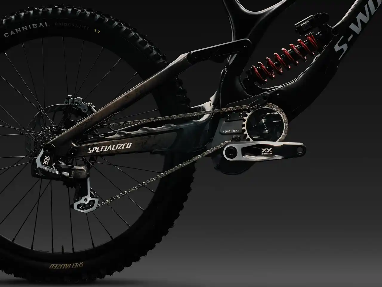 HighGearは、特許出願中のドライブトレインシステム。路面クリアランスを30mm拡大すると同時に、サスペンションに対する不要なドライブトレインの影響を排除します。これにより、最適化されたアクスルパスと、ほぼペダルキックバックのない、完全にアクティブなサスペンション性能を実現します。SRAMと共同開発され、妥協のない信頼性を備えています。 |