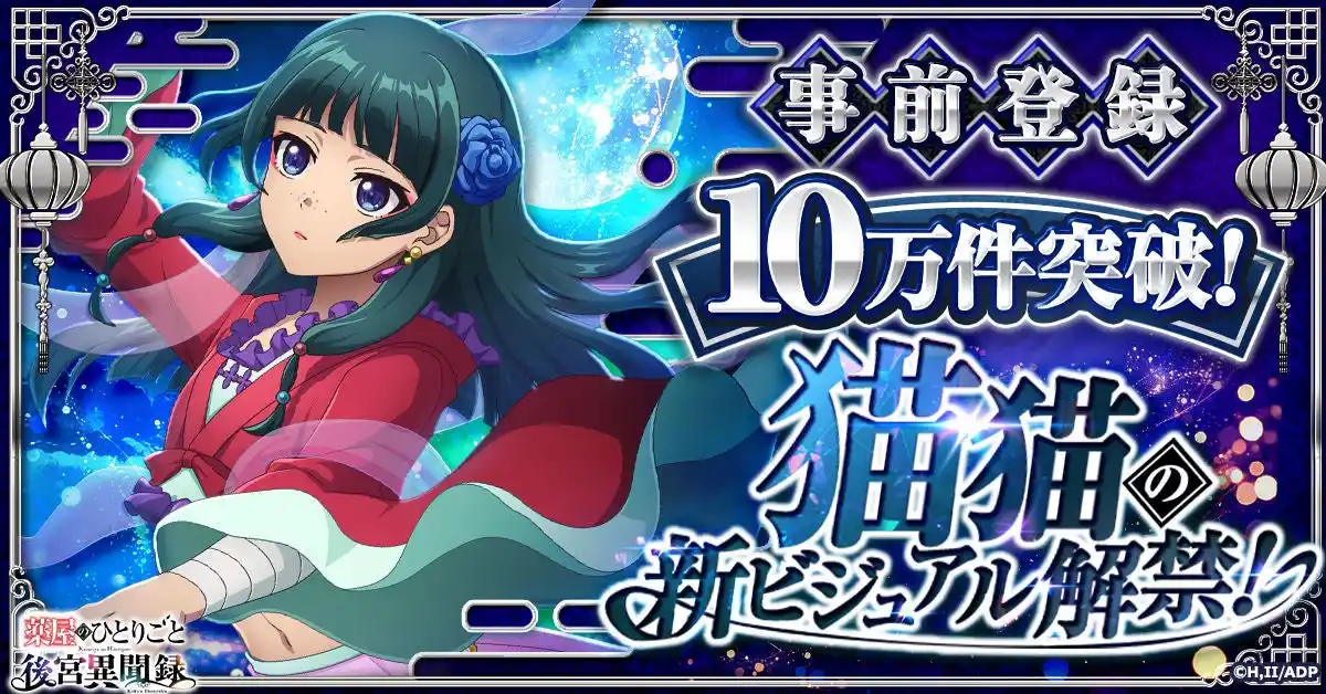 10万件達成を記念して、猫猫が美しく舞う新ビジュアルが公開されました。今後も複数のキャラクターによるゲーム描き下ろしイラストを公開していく予定です。最新情報は、公式SNSをご確認ください。 |