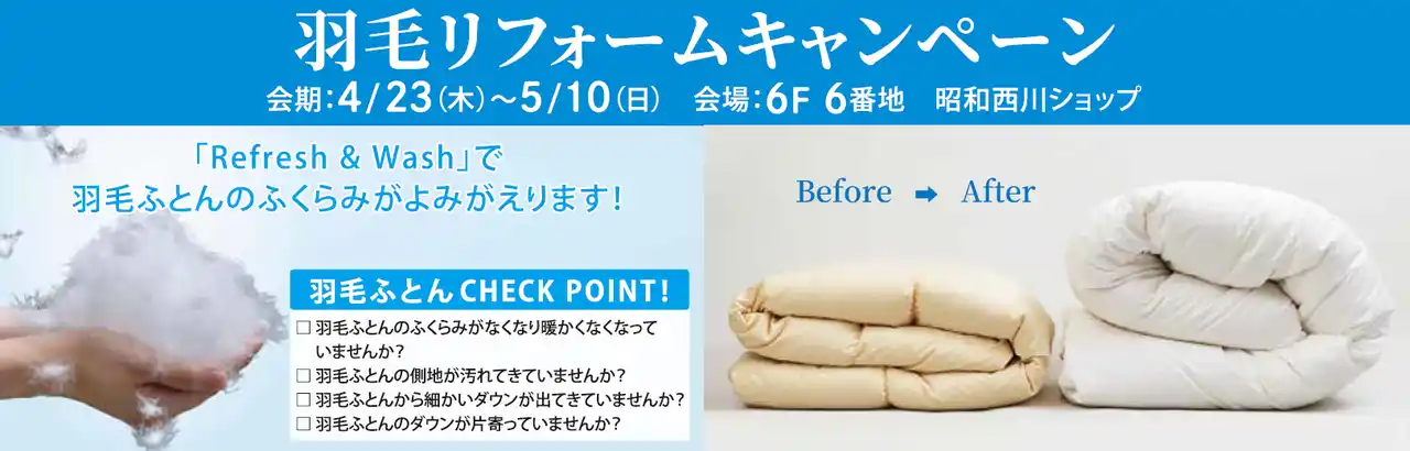 また、期間中は対象商品の特別販売のほか羽毛ふとんのリフォームキャンペーンも同時開催します。 |