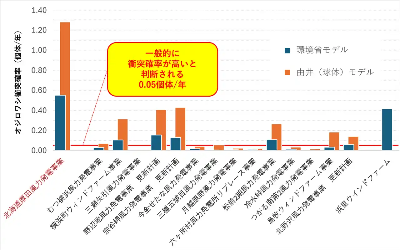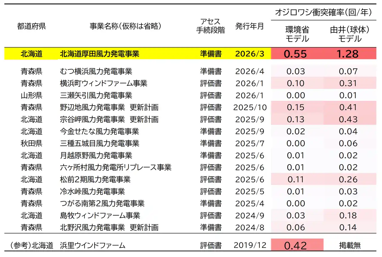 2024年度以降に環境アセス図書(準備書・評価書)を提出した15事業(本事業を含む)と2019年に評価書を提出した浜里ウインドファーム(環境省モデルのみ掲載)における比較。なお、浜里ウインドファームはオジロワシの大量バードストライクの発生を受け、2026年1月以降現在も日中稼働を中止している(2026年4月時点)。他事業と比べても本事業の衝突確率が著しく高いことがわかる。 |