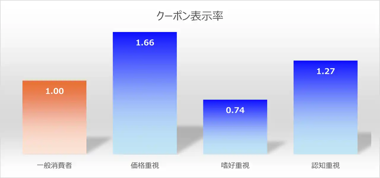 本実証の結果、価格を重視する「価格重視」クラスタでは、一般のお客さまと比較してクーポン表示率が1.66倍、購入率が1.76倍とクーポンへの反応が最も高いという結果が見られました。また、自分の好みを重視する「嗜好重視」クラスタは一般のお客さまと比較して、クーポン表示率が0.74倍、購入率が0.6倍と「反応期待率」から予測した見解の通り、クーポンへの反応が低いという結果となりました。 |