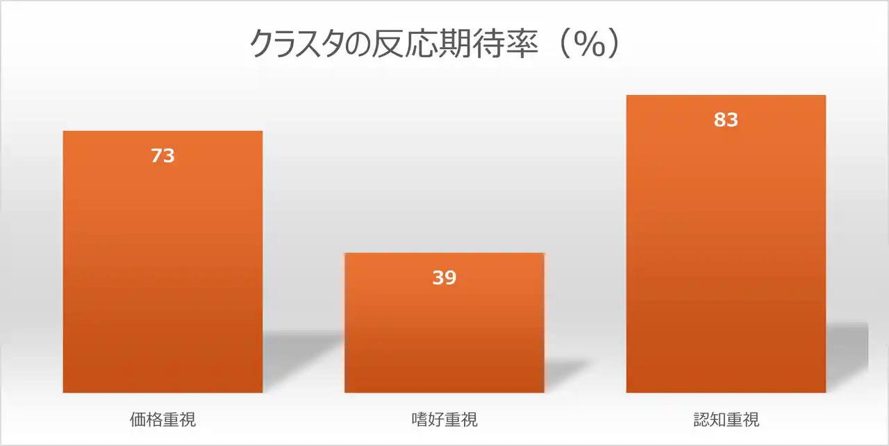 また、今回作成した3種類のクラスタについては実際にクーポンを配信する前に仮想マーケティング技術を使い、バナーの閲覧やクーポンの表示、商品の購入などクーポンに対してお客さまが行動を起こす可能性を示す「反応期待率」の予測をクラスタごとに行いました。その結果、自分の好みを重視するという特性をもつ「嗜好重視」クラスタの「反応期待率」の数値は低く、実際の配信においても「嗜好重視」クラスタに類似するお客様のクーポン表示率および購入率も低くなる可能性があるという見解を立てていました。 |