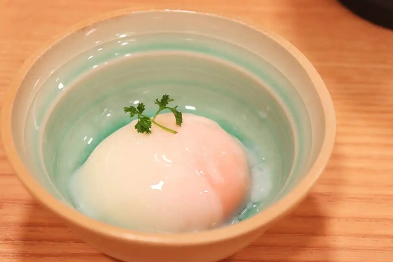 | 低温で丁寧に火入れした「柚子の香り 温泉卵」は、なめらかな口当たりとともに柚子の香りがふわりと広がる一品。塩で味わうことで、甘みとコクがより一層引き立ちます。 | |||