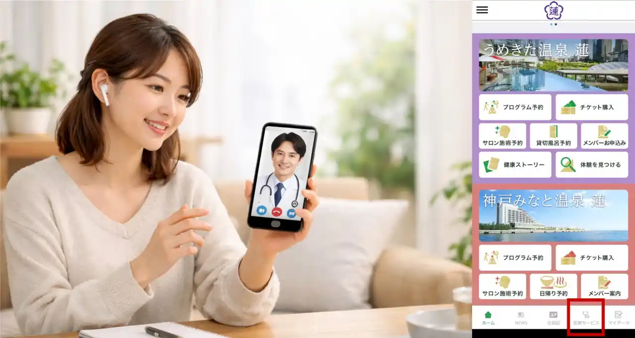 | 「株式会社ラスイート」(代表取締役社長:関 寛之、所在地:大阪市)は、2026年4月22日より、「うめきた温泉 蓮 Wellbeing Park」ならびに「神戸みなと温泉 蓮」の公式アプリ「RENアプリ」のオンライン診療サービスに「温泉療養指示書」の発行が可能となるサービスを追加することをお知らせします。 | |||||||||||||||||||