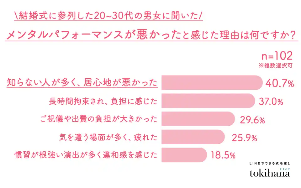 一方で、参列者の17.8%は「メンタルパフォーマンスは良くなかった」と回答しました。 その理由としては、「知らない人が多く、居心地が悪かった(40.7%)」「長時間拘束され、負担に感じた(37.0%)」「ご祝儀や出費の負担が大きかった(29.6%)」などが挙げられました。 |