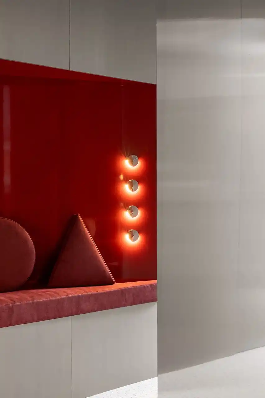 さらに展示エリアの最後には、3D熱成形技術を用いて立体的な石積みを表現した「ブニャート(bugnato)」様式の壁面が登場。ALCANTARA(R)の豊かなテクスチャーが光と影の美しい陰影を際立たせ、空間をドラマチックに演出しています。 |