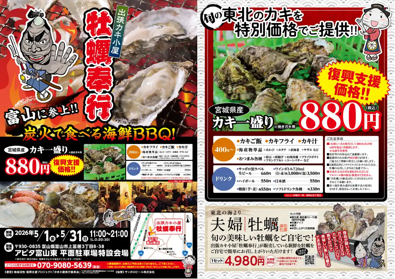 東日本大震災で販路に苦しむ東北の牡蠣を、多くの人に食べてほしいとの想いで始まった復興支援イベント。震災を風化させない取り組み、漁港の活性化、継続的な東北復興支援と地域振興を目的にを全国で続ける。 |