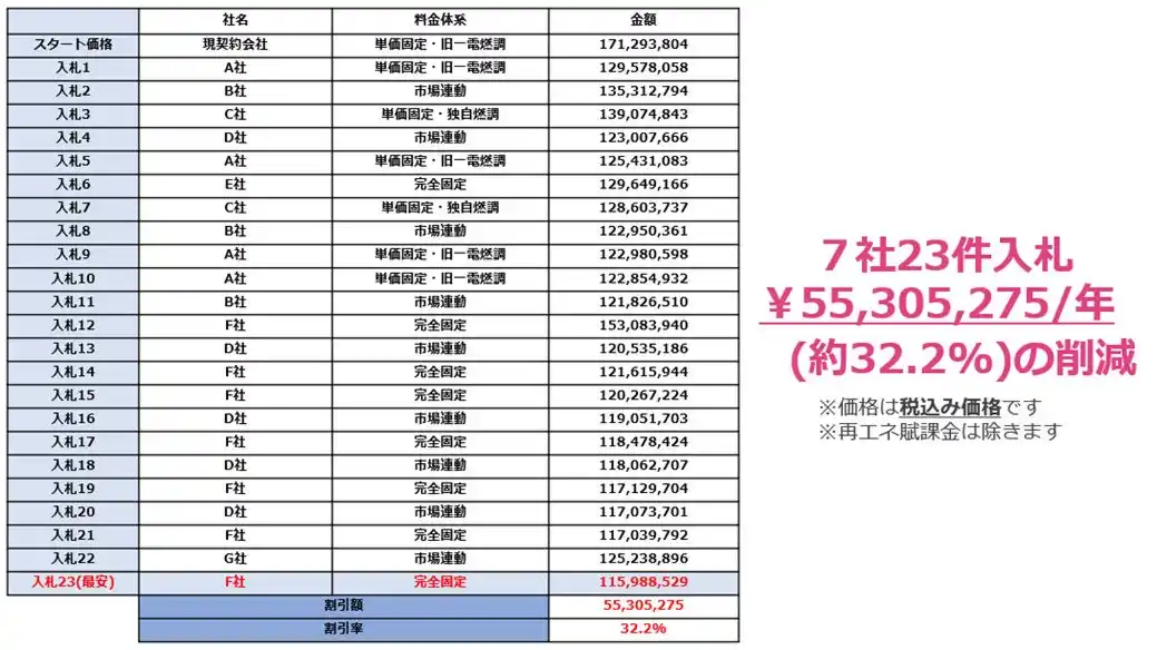 | 戸田市では、電力価格の高騰に伴う料金体系の複雑化により、従来の入札プロセスでの電力調達業務が難しくなっていることが問題となっていましたが、今回リバースオークションを行った結果、計7社から23件の入札があり、再エネ化だけでなくコスト削減も実現することができました。 | |||