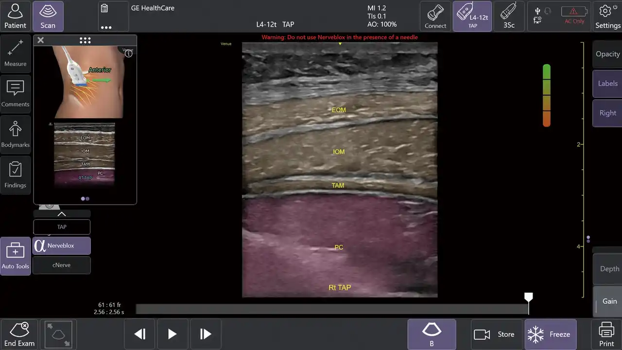 Nervebloxによる神経ブロックのサポート (中央)Anatomical Labeling: 画像上に解剖学的ラベルを略語形式で表示 (右上)Quality Meter:表示画像の品質をリアルタイムで評価して色分け表示 |