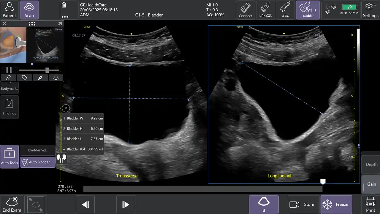 Auto Bladder Volumeにより2断面から半自動的に膀胱容積を計算 |