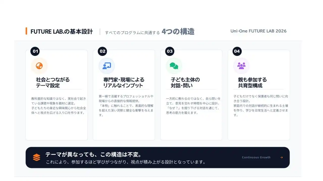 FUTURE LABは、 教育・家庭・社会の間にあるギャップを接続し、 次世代の意思を育てる取り組みとして構想されました。 |