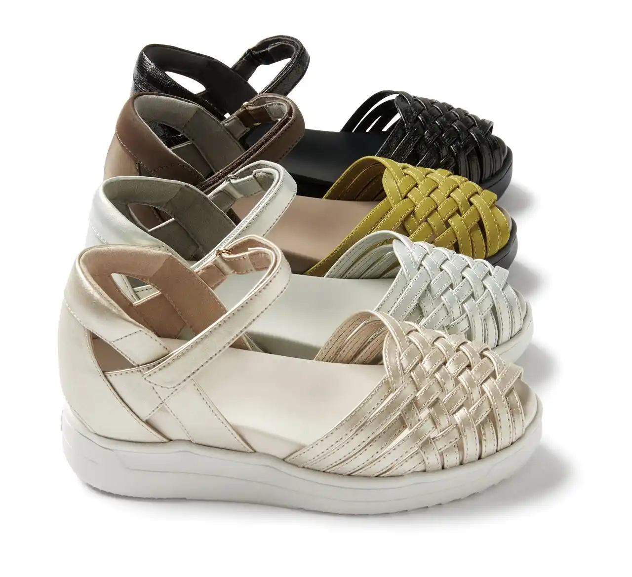 つま先とかかとを覆うデザインで露出を抑えつつ、通気性を確保。フロントはやわらか素材を編み込んだメッシュ仕様で、足指をやさしく包み込みます。 |