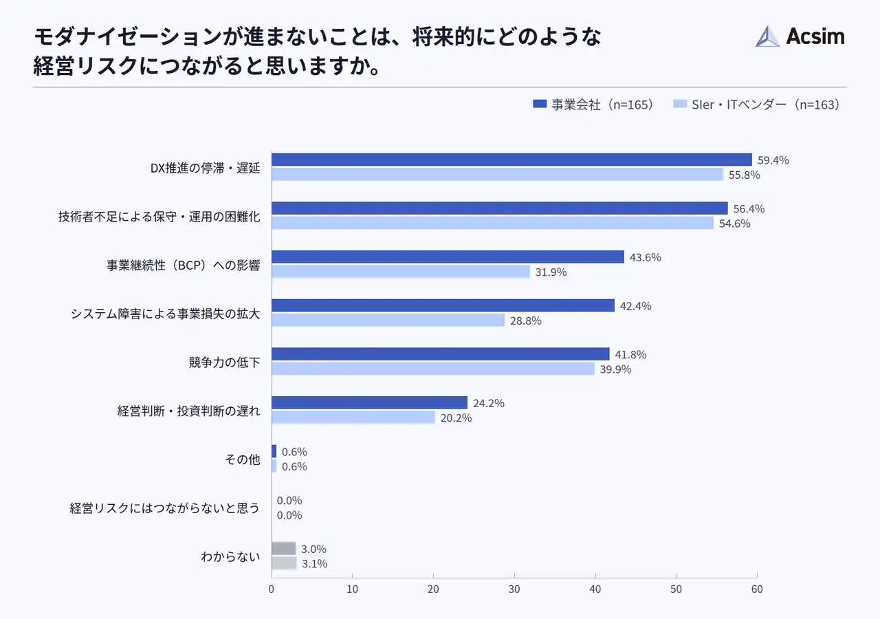 モダナイゼーションが進まない場合の経営リスクを尋ねたところ、事業会社、SIer共に「DX推進の停滞・遅延」、「技術者不足による保守・運用の困難化」が半数を越えており、将来的なリスク認識は双方で共通する結果となりました(n=165/事業会社、n=163/SIer・ITベンダー)。 |