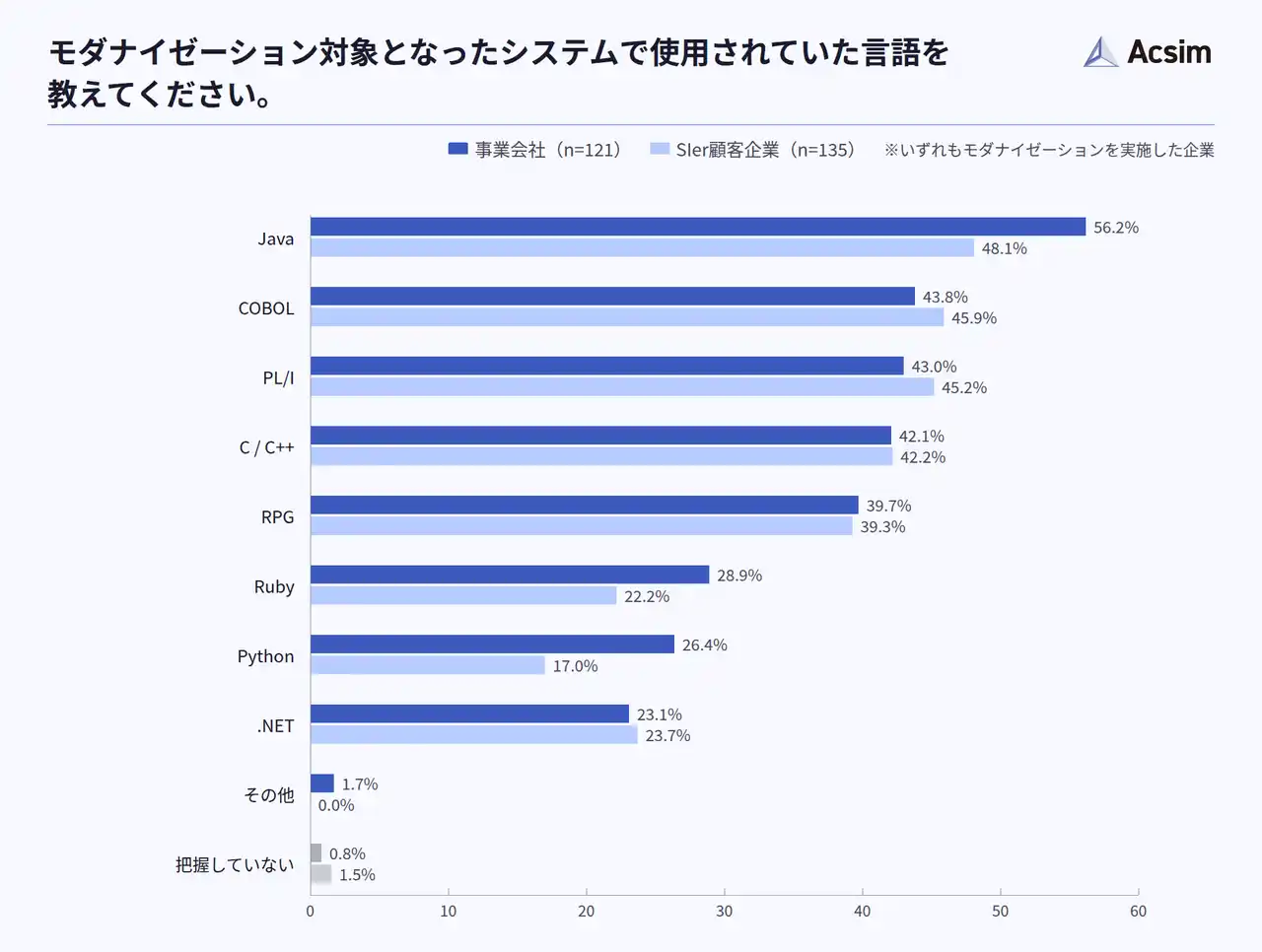モダナイゼーションの対象は、レガシー言語に限定されず、Javaにも広がっていることがうかがえます(モダナイゼーションを実施した企業/事業会社n=121、SIer顧客企業n=135)。 |