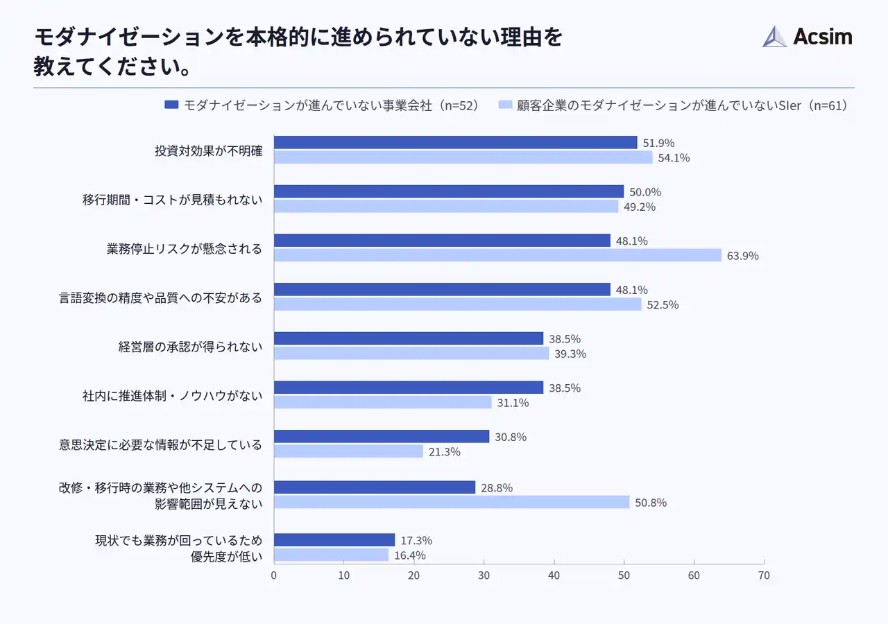 本調査から、モダナイゼーションは多くの企業において「必要性は認識されているものの、実行に踏み切れていない」状態にあることが明らかになりました。 |