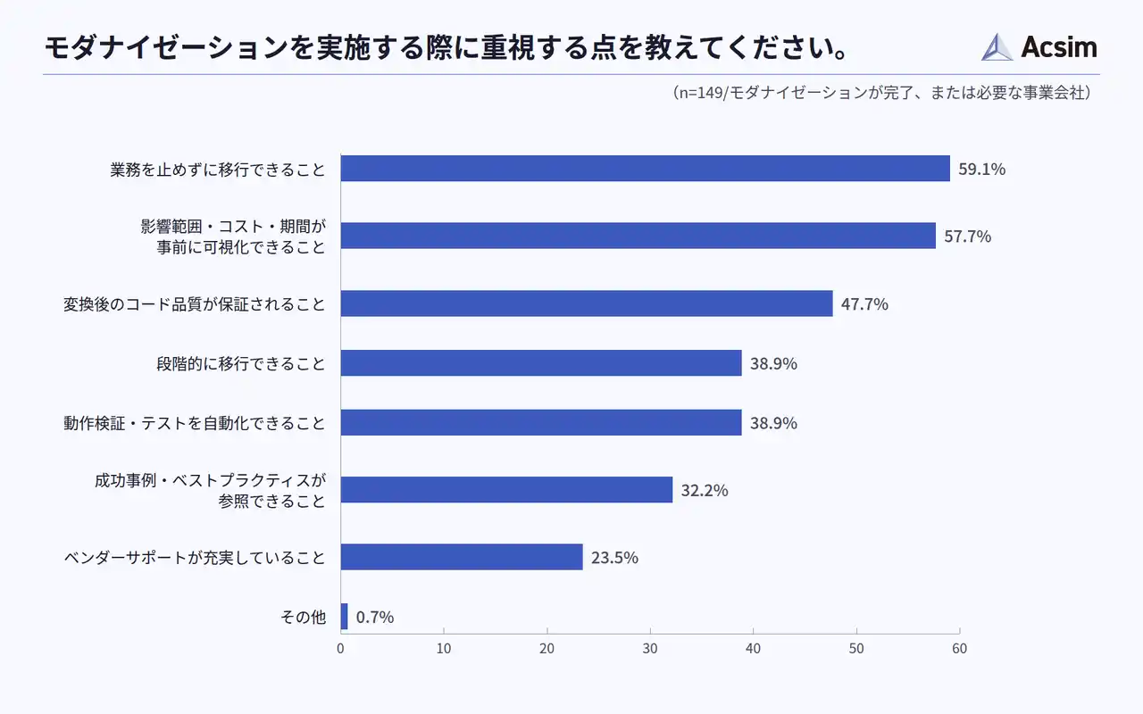 モダナイゼーションで重視する点を尋ねたところ、「業務を止めずに移行できること」が59.1%で最も多く、「影響範囲・コスト・期間を事前に可視化できること」が57.7%、「変換後のコード品質が保証されること」が47.7%と続き、移行の安全性と事前の見通しを重視する傾向がみられました(n=149/モダナイゼーションが完了、または必要な事業会社)。 |