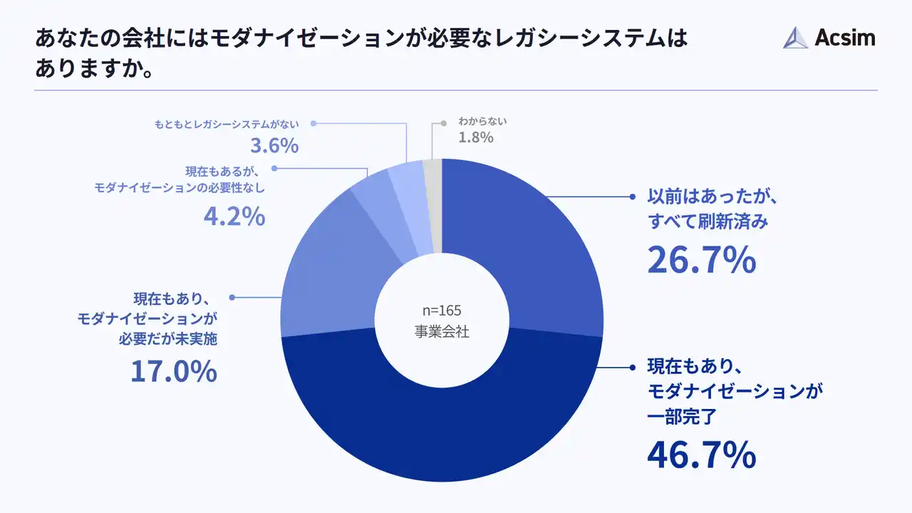 一方で、「現在もあり、モダナイゼーションが必要だが未実施」が17.0%と、約2割が必要性を認識しながらも未着手の状態にあることも明らかになりました(n=165/事業会社)。 |