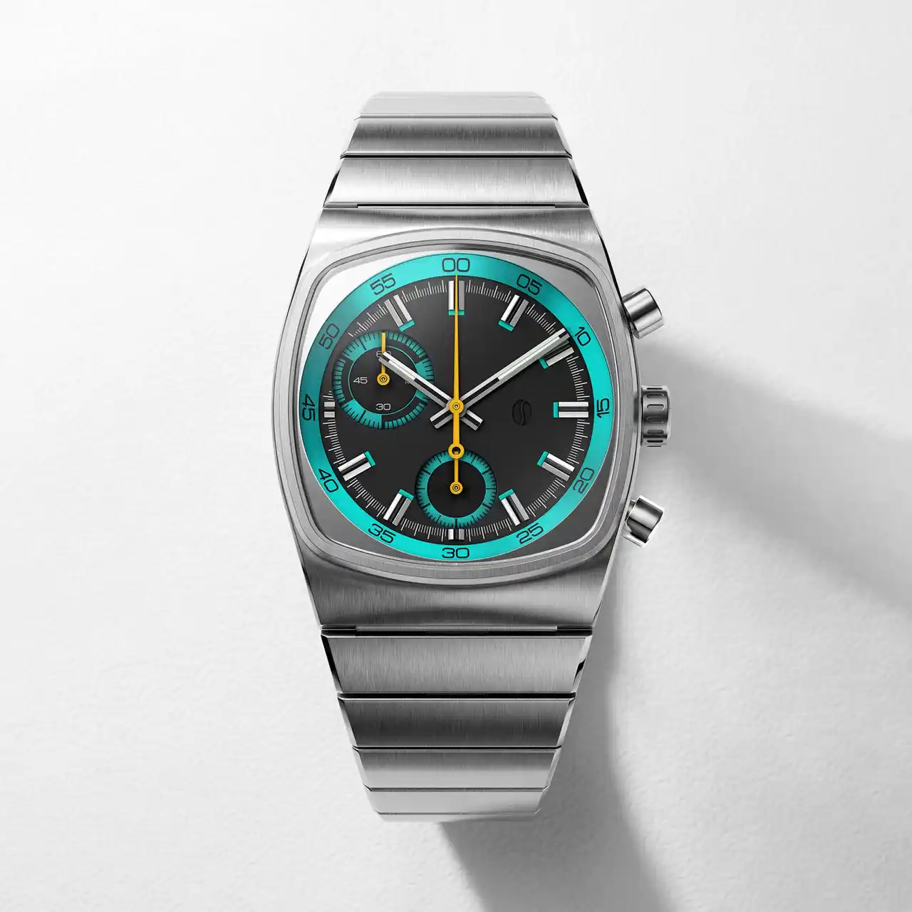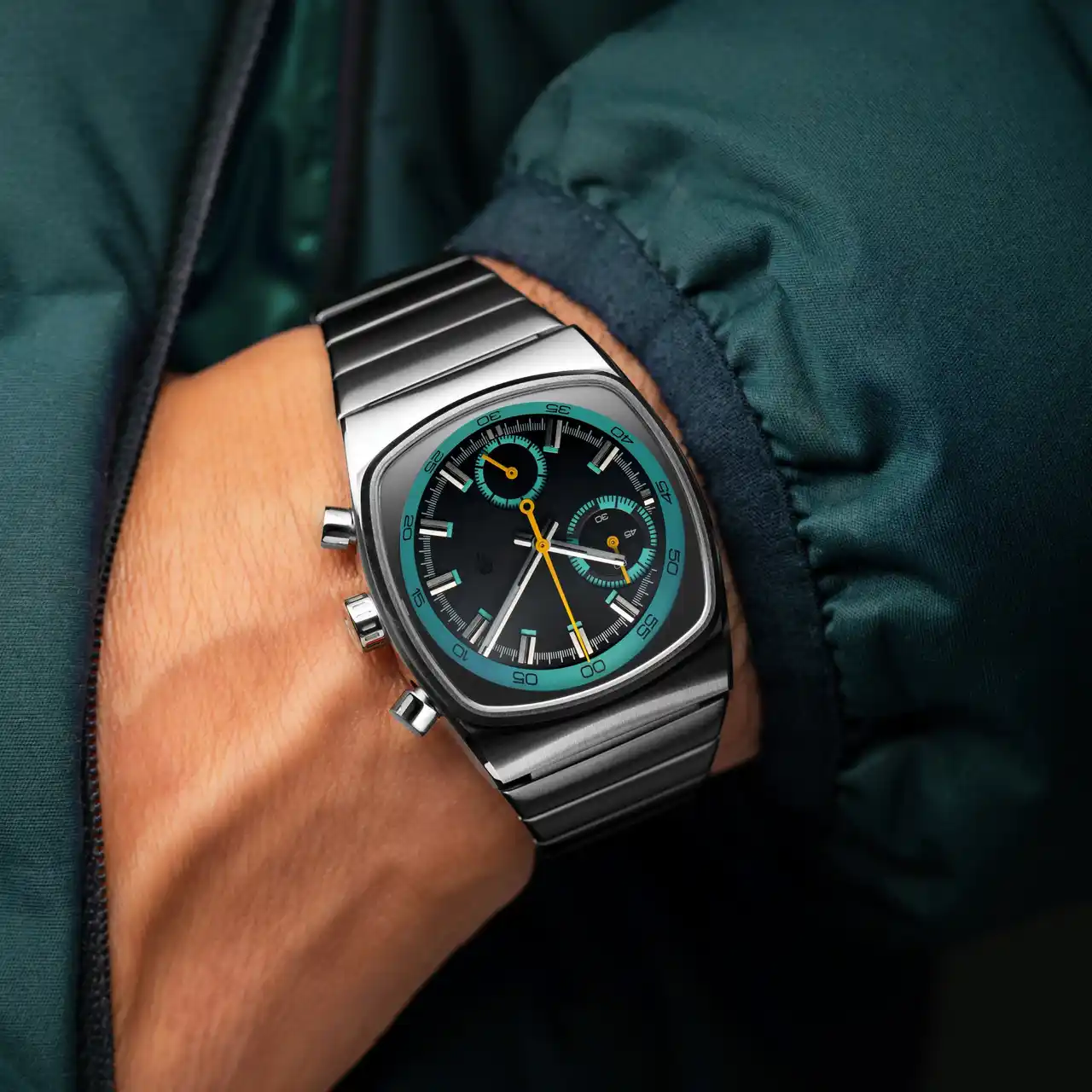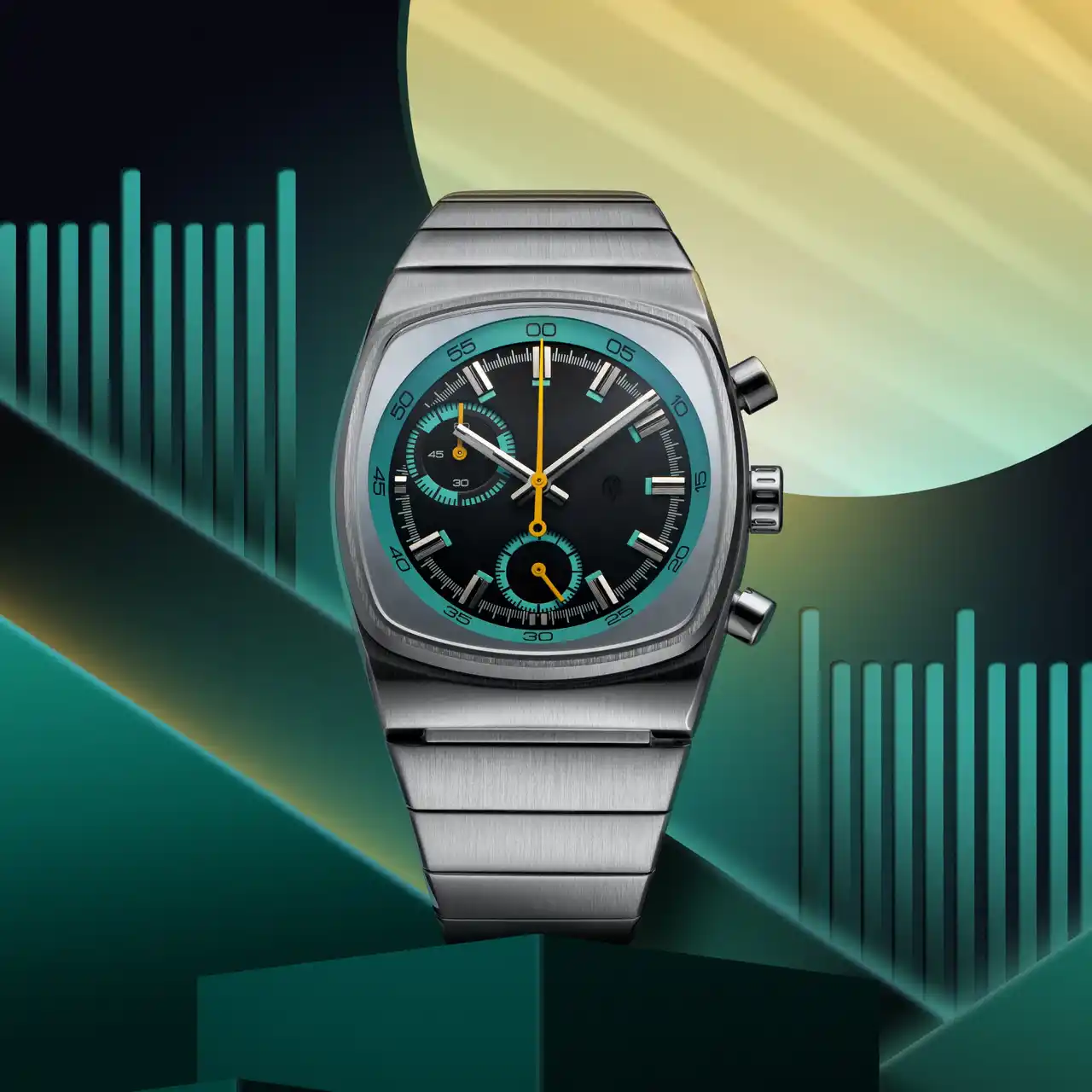 ベースモデルは、70年代のようなブラウン管を彷彿とさせるケースを採用したMetricシリーズ。洗練された計器のようなインダストリアルの見た目と、ティール&ブラックに差し色のイエローがフューチャリスティックに融合したデザイン。 |